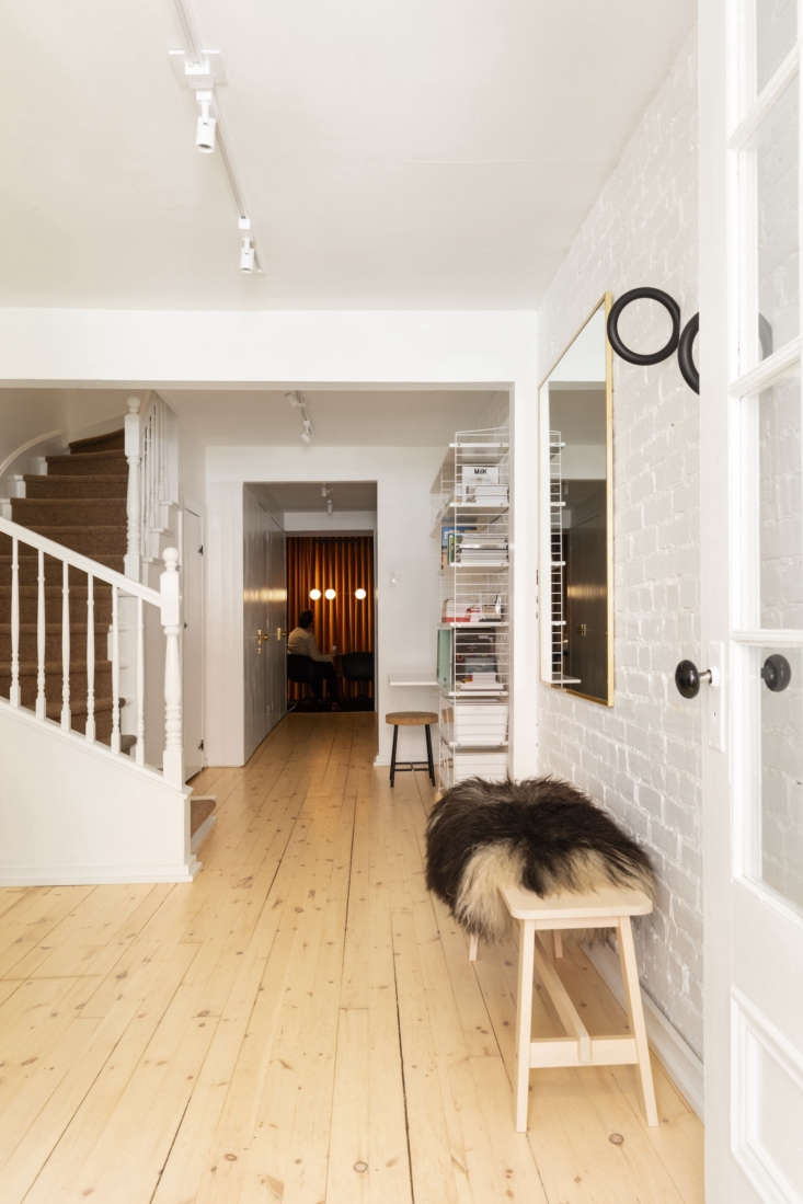 Above: The front door leads to the ground floor, which Michael has turned into his dedicated design studio. “We didn’t want to have the feeling of living in an office, and we also we didn’t want the client to have the impression of being in our home,” he explains of their decision to silo the office to this floor. Two black Gym Hooks by Hay hang at the ready for coat storage.