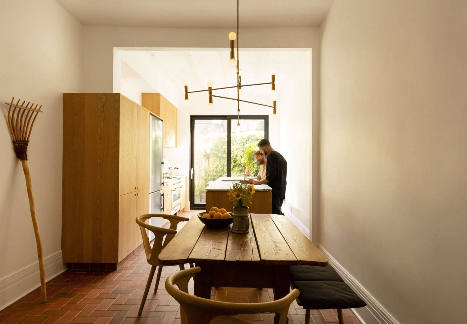Above: The couple furnished their home with a mix of vintage finds, new modern pieces, and family heirlooms, including the dining table and the rake, both from Mathieu’s side of the family. “His mother and father where living in Iraq for a time. They used it to scrape the sand,” says Michael of the rake.,
