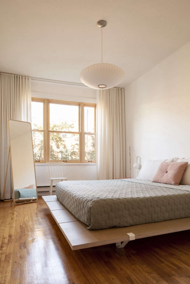 Above: The third floor has two bedrooms. Here, simplicity abounds. A Nelson bubble lamp hangs above a platform bed from Floyd. The mirror is from Ikea.