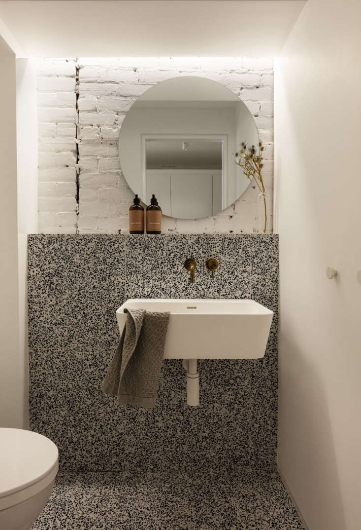 Above: The terrazzo powder room, featuring a sink from Porcelanosa.,