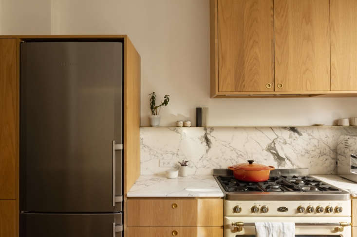 Above: The custom oak cabinetry is by Éco-Ébénisterie Saint-Dominique. A slim shelf rests above the backsplash.