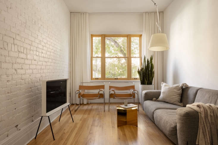 Above: The simple living room, with a Serif TV by the Bouroullec brothers for Samsung. The couple chose Sherwin Williams’ High Reflective White for the walls throughout the home. The wood floors are original; they were simply sanded and treated with a matte varnish.