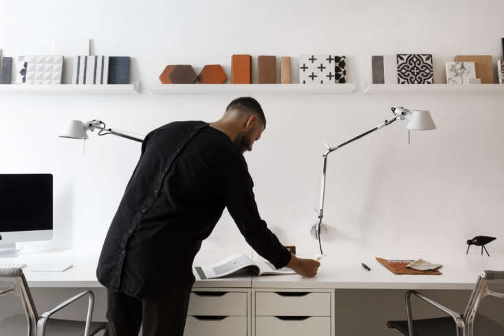 Above: Michael in front of simple built-in desks and a display of tile samples. Under the desk are two Alex Drawer Units from Ikea.