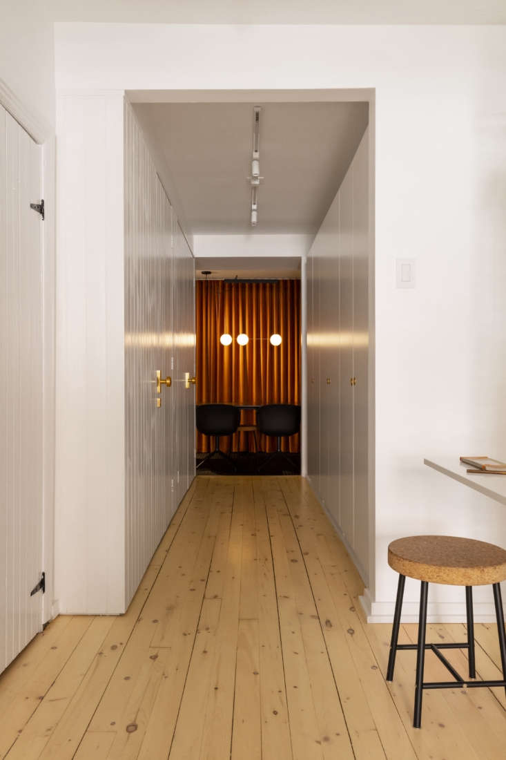 Above: Another Ikea find: the Sinnerlig cork stool designed by Ilse Crawford, now discontinued. Michael decided to turn the middle, window-less portion of the floor over to storage and utility closets and a powder room.