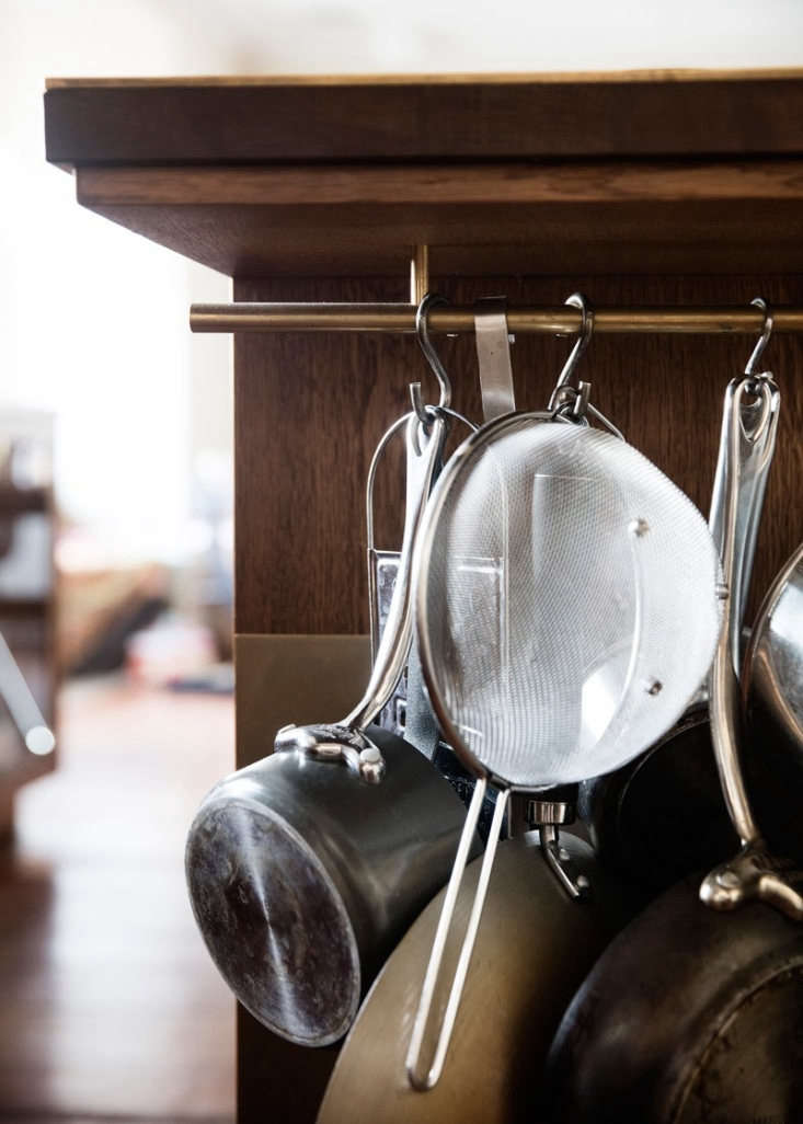 Above: Challenged to find space to hang pots and pans and kitchen tools, the designers inserted a brass rod under the deep counter and detailed the island with a tall brass toe kick.