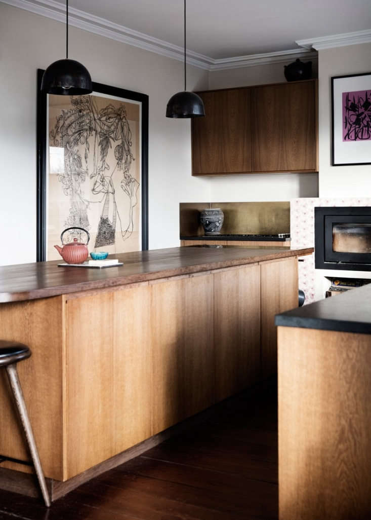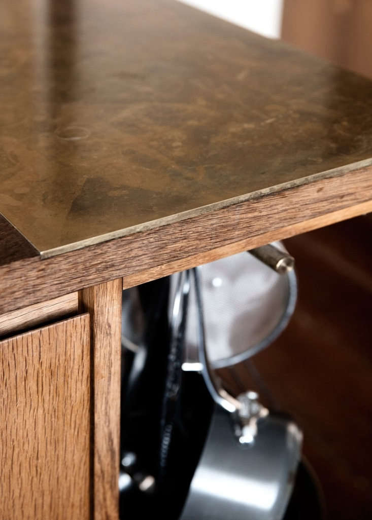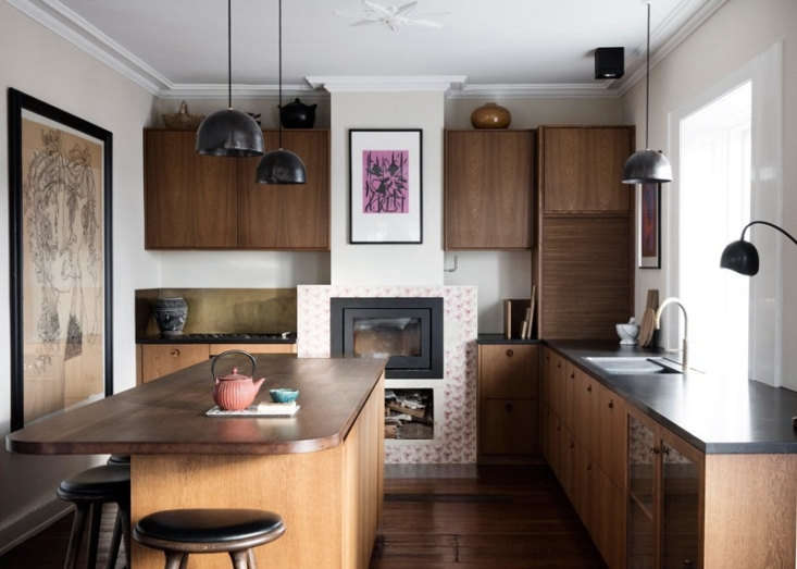 Scandinavian contemporary kitchens are known for their pale, stripped-down allure. But this custom design by KBH Københavns Møbelsnedkeri (translation: Copenhagen Cabinetmaking) plays against type. Equal parts refined and homey, it’s composed of fumed oak, dark stone, and patinated brass mingled with artwork and patterned tiles. A combination island/breakfast counter dominates the floor space. Look closely and you’ll spot the world’s chicest appliance garage. and there’s a true hearth in the center of it all.