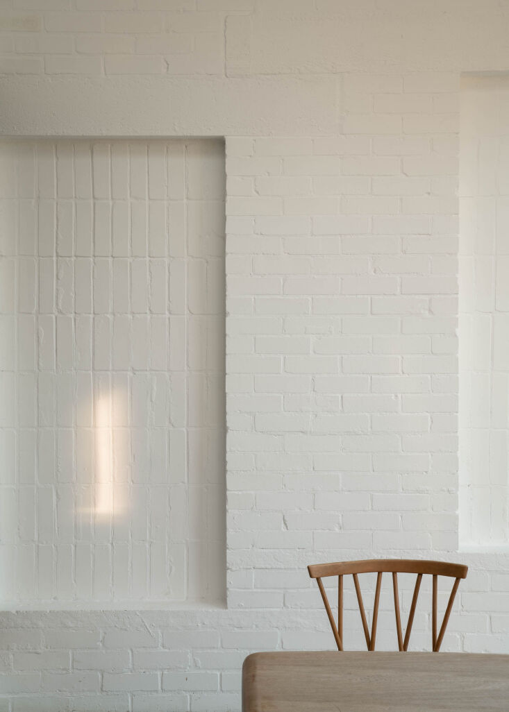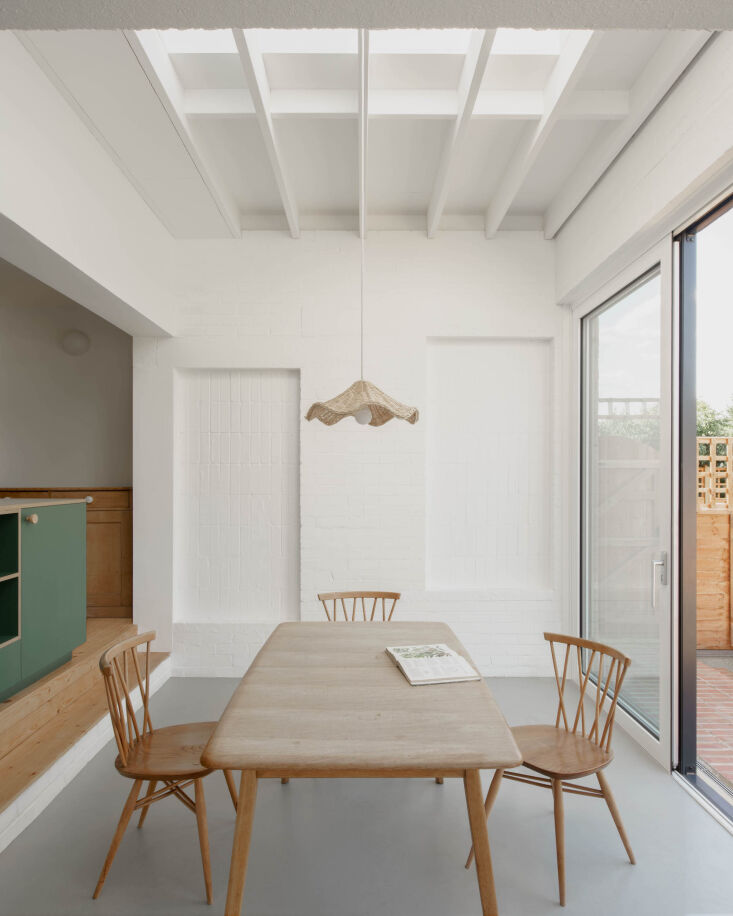Above: “We were looking to build the extension with as few materials as possible, keeping it fast and low-cost,” says Thom. “There are no plasterboard finishes within the extension. The same brick is used for the external walls, stepped terrace, and internal walls where it is painted [Benjamin Moore Brilliant White].”
