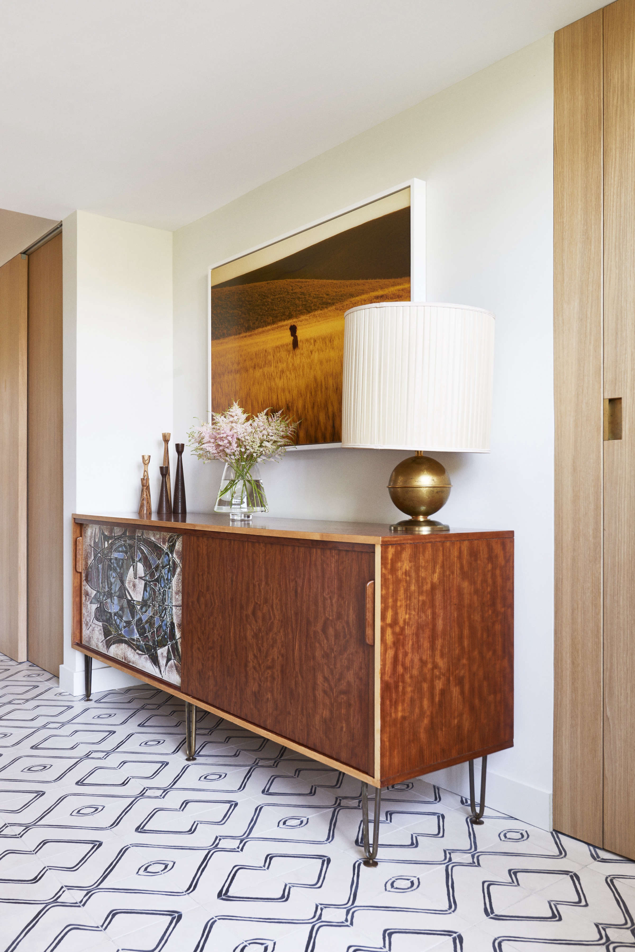 Above: The cement tile extends into the entry, furnished with a vintage sideboard by Belgian designer Alfred Hendrickx and a Jacques Adnet brass lamp. The photograph, Golden Grassland, is by Ryan McGinley.