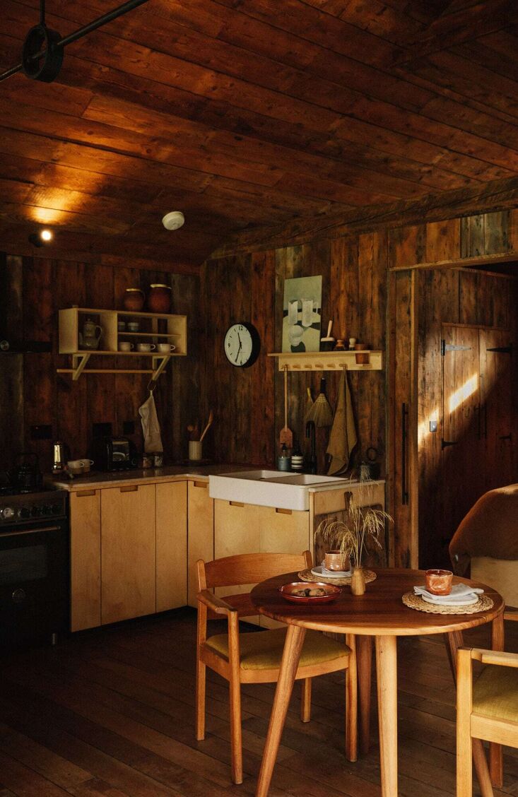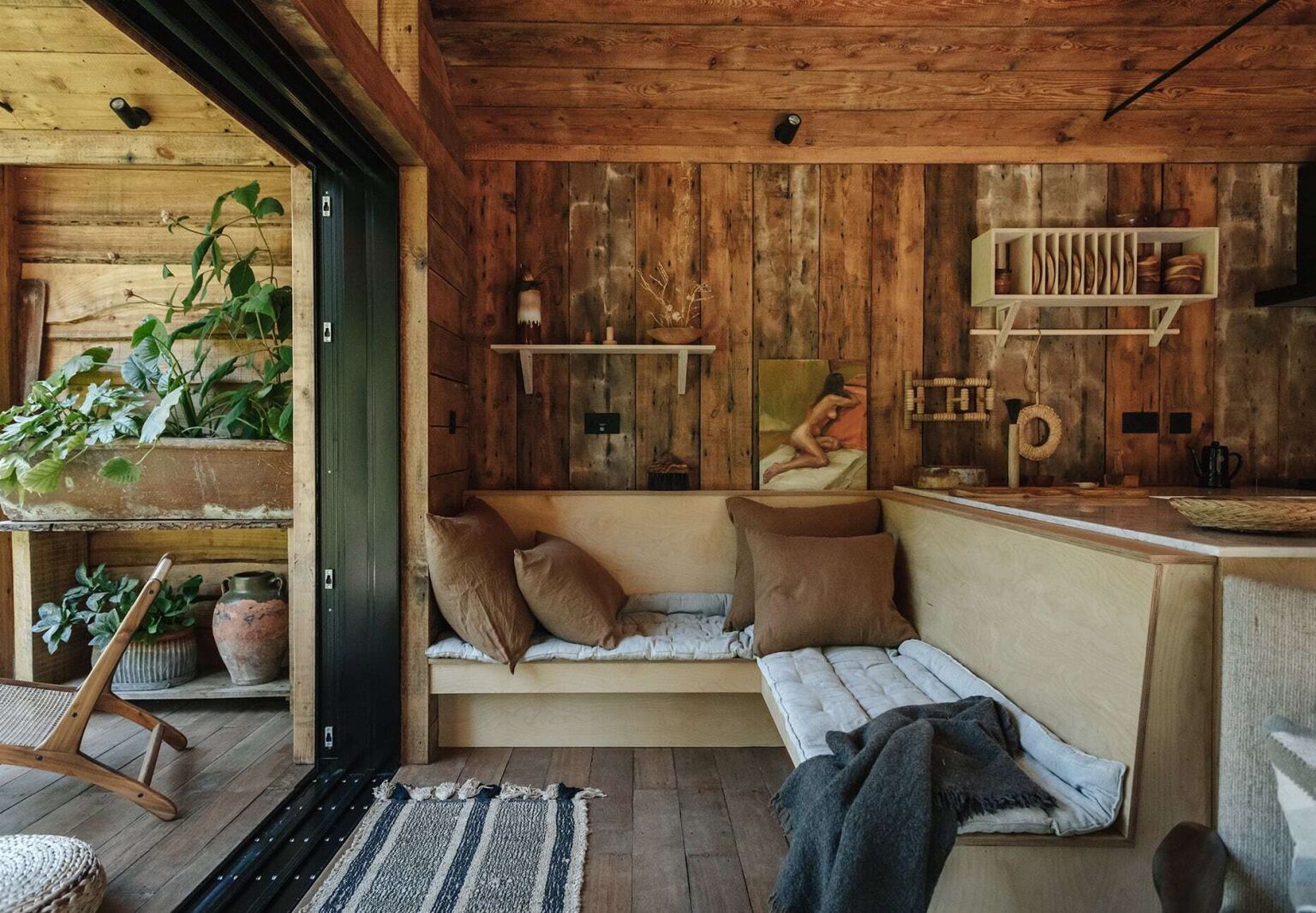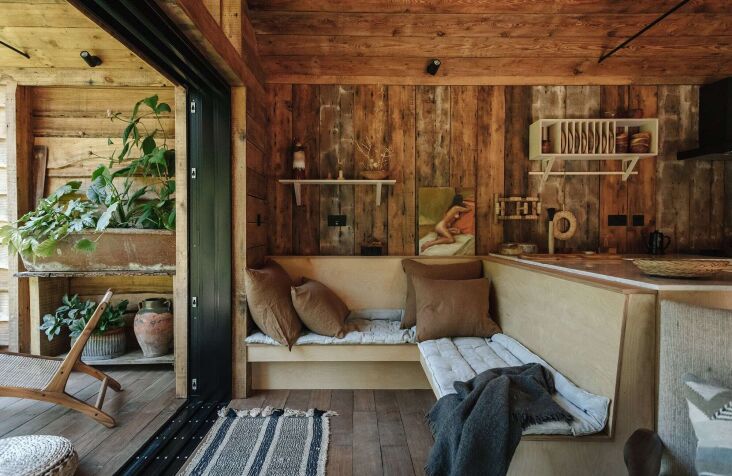 Above: The interior is paneled in reclaimed wood. The benches front the kitchen counter.