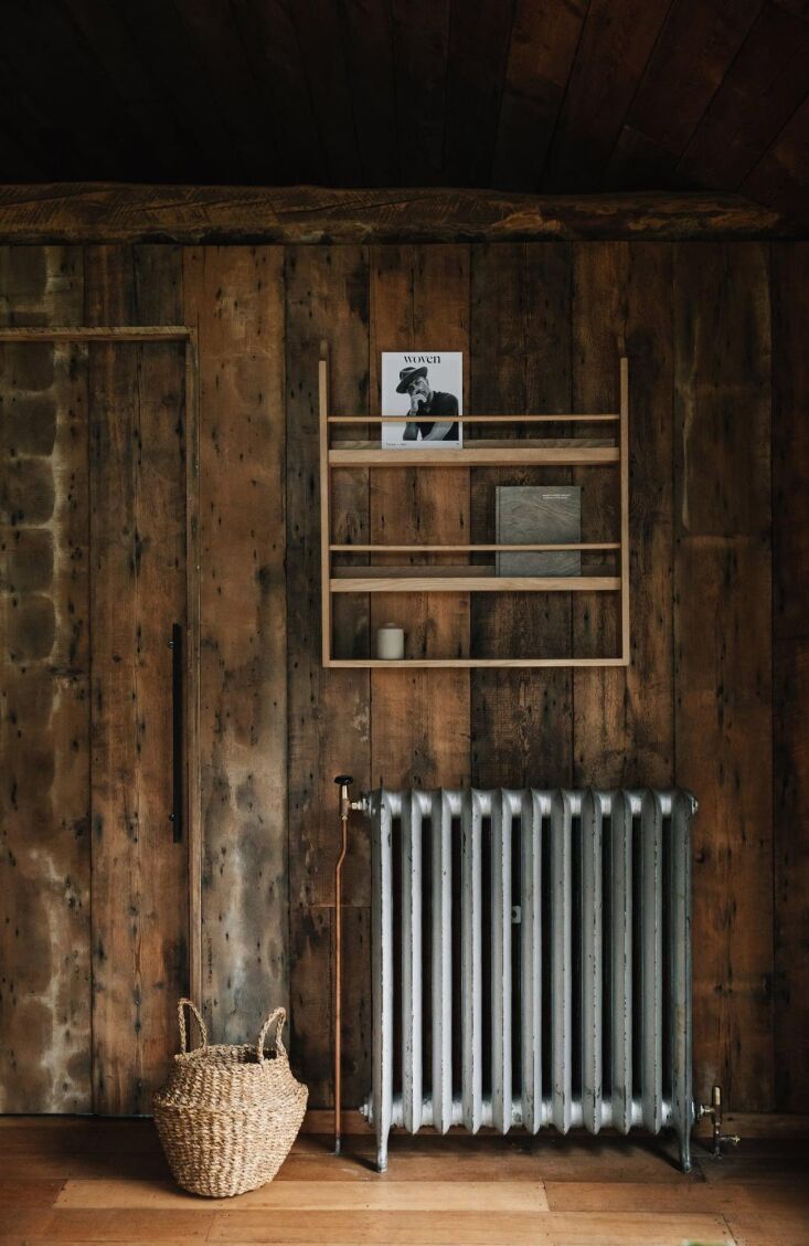 Above: The cabin is heated with vintage cast-iron radiators as well as a new wood-burning stove.