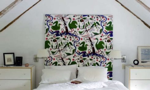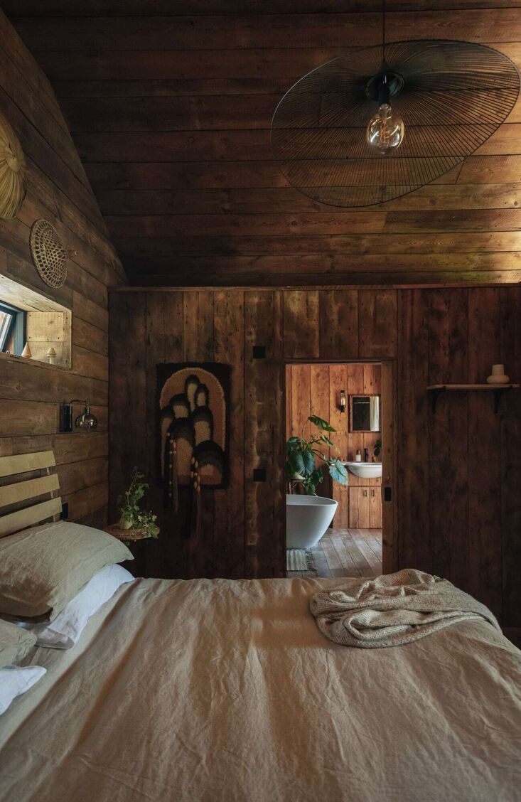 Above: The paneling continues in the bedroom—horizontal on the gable end, vertical everywhere else. The linens on the king-size mattress are from Piglet in Bed.,