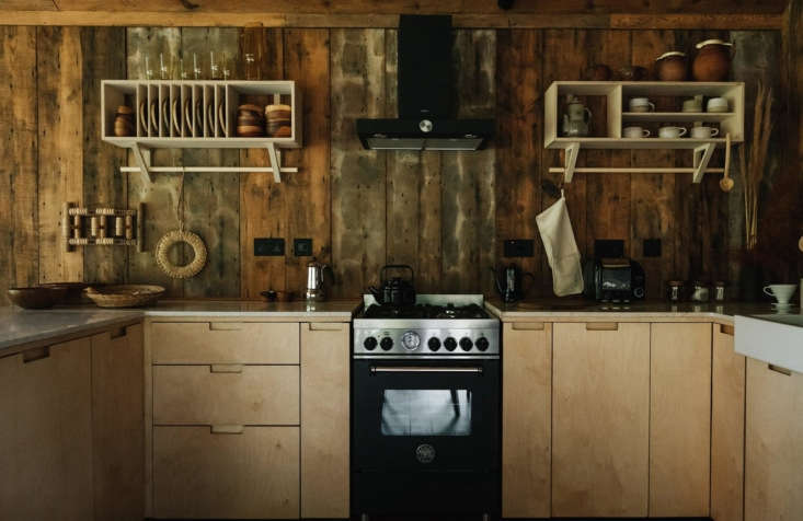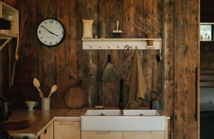 Above: The wall-hung shelves are by Remodelista favorite Woodchuck: see Tinta and Rutger Luhrman’s own kitchen here. Woodchuck’s Yori Shelf holds utensils over the sink. The matte black faucet is by Meir. Jo stocks the quarters at Settle with wares by small makers, many of them local. A selection are for sale in the Settle boutique.