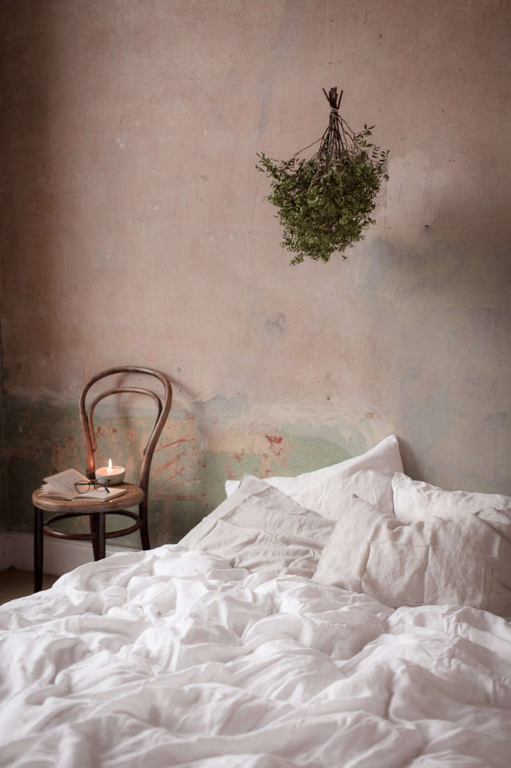 Above: The master bedroom is cloaked in Libeco Belgian Linen. Suspended from hooks, the bedside porcelain hanging lights, also seen in the kitchen, are by deVol. The bed is from Gervasoni’s Ghost collection by Paola Navone.