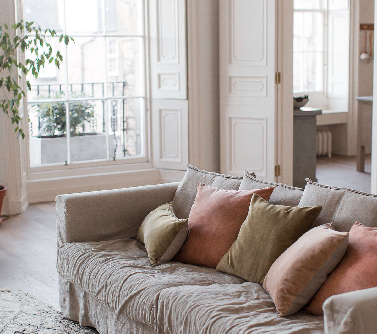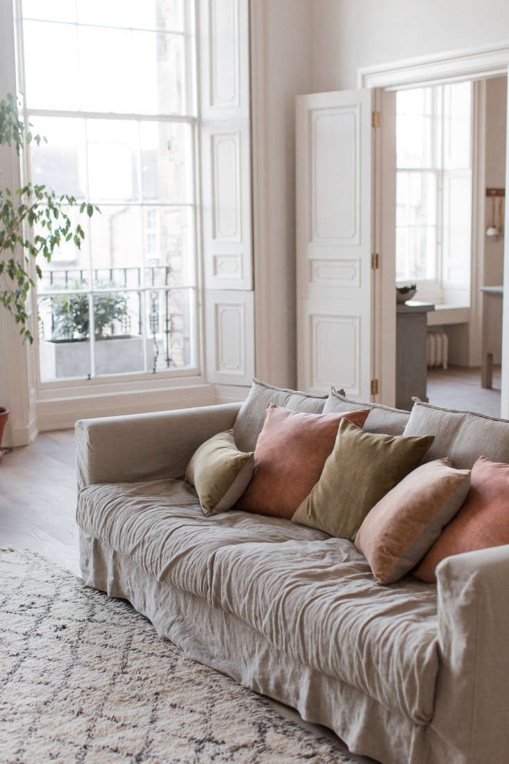 Above: During the several months Nina and Craig were awaiting building permits, they lived in the apartment with just a sofa and a mattress on the floor. Decotique’s Le Grand Air design shown here came with its linen slipcover; it showcases Kirsten Hecktermann’s hand-dyed Velvet Jewel Cushion Covers, a longstanding Remodelista favorite made in custom colors for Ingredients LDN.