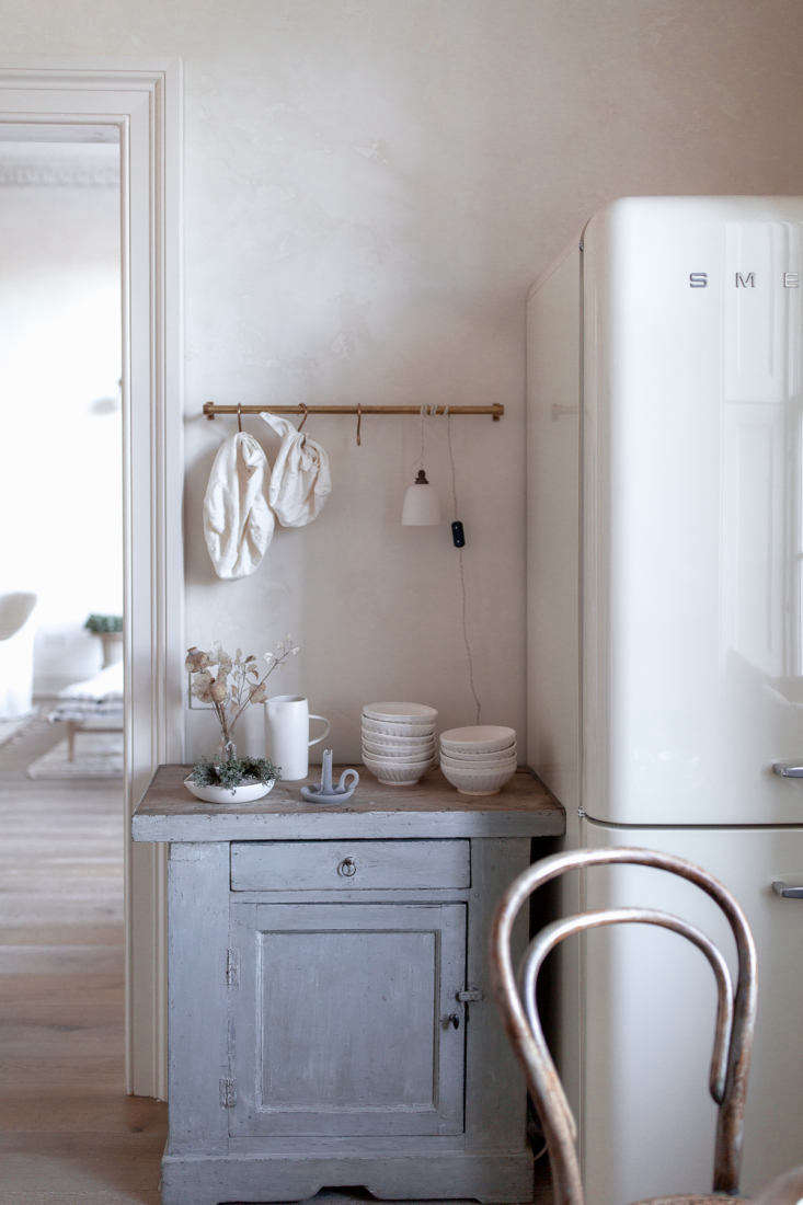 Above: An antique French bread cupboard “complete with original knife marks” stands alongside the Smeg fridge. The stacked Fluted Soup Bowls are by Judy Jackson of NYC; the gray Tallow Candle is a Dutch design. The brass hanging rail and hooks are from deVol.,