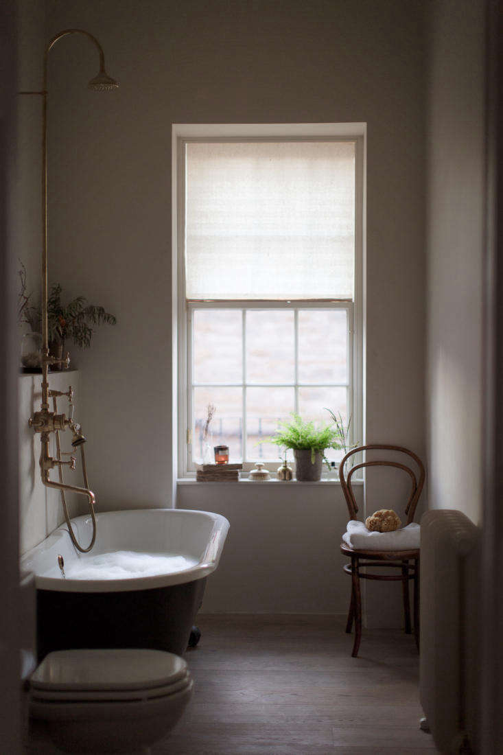 Above: The couple converted a bedroom into the master bath. The new roll-top bathtub was purchased from C.P. Hart and painted Farrow & Ball’s Off Black. The brass shower and faucets are a customized Barber Wilson ensemble. The ledge provides open storage and conceals the plumbing for this bathroom and the one on the other side of the wall.