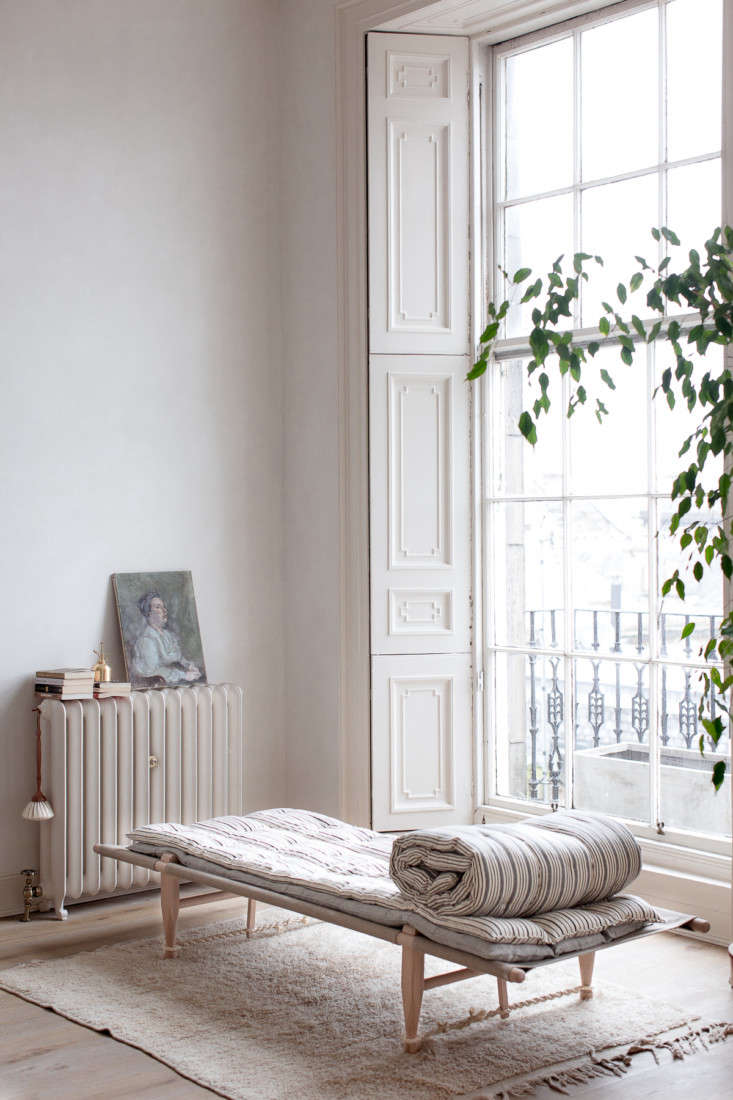 Shown here, the Danish classic OGK Safari Daybed cushioned with Kapok Mattresses made in West Africa of hand-woven cotton stuffed with silky kapok fibers (note that goods often sell out on ILDN and get replenished). The Carron cast-iron radiator is new and took many hands to lug up the stairs.