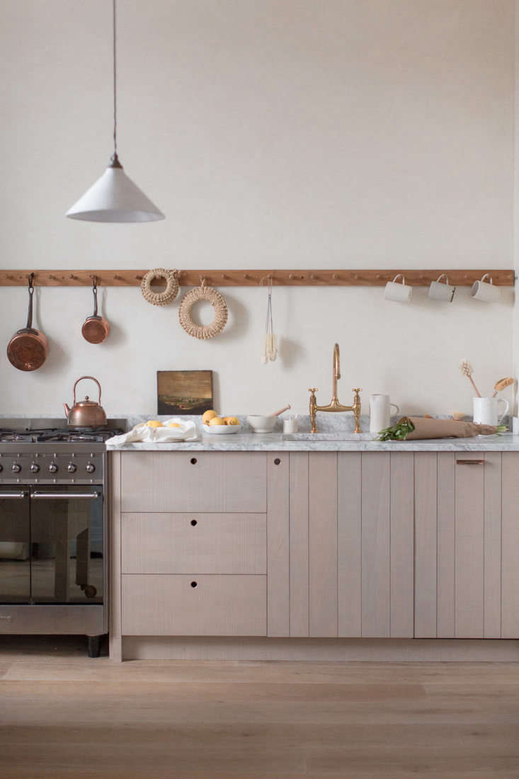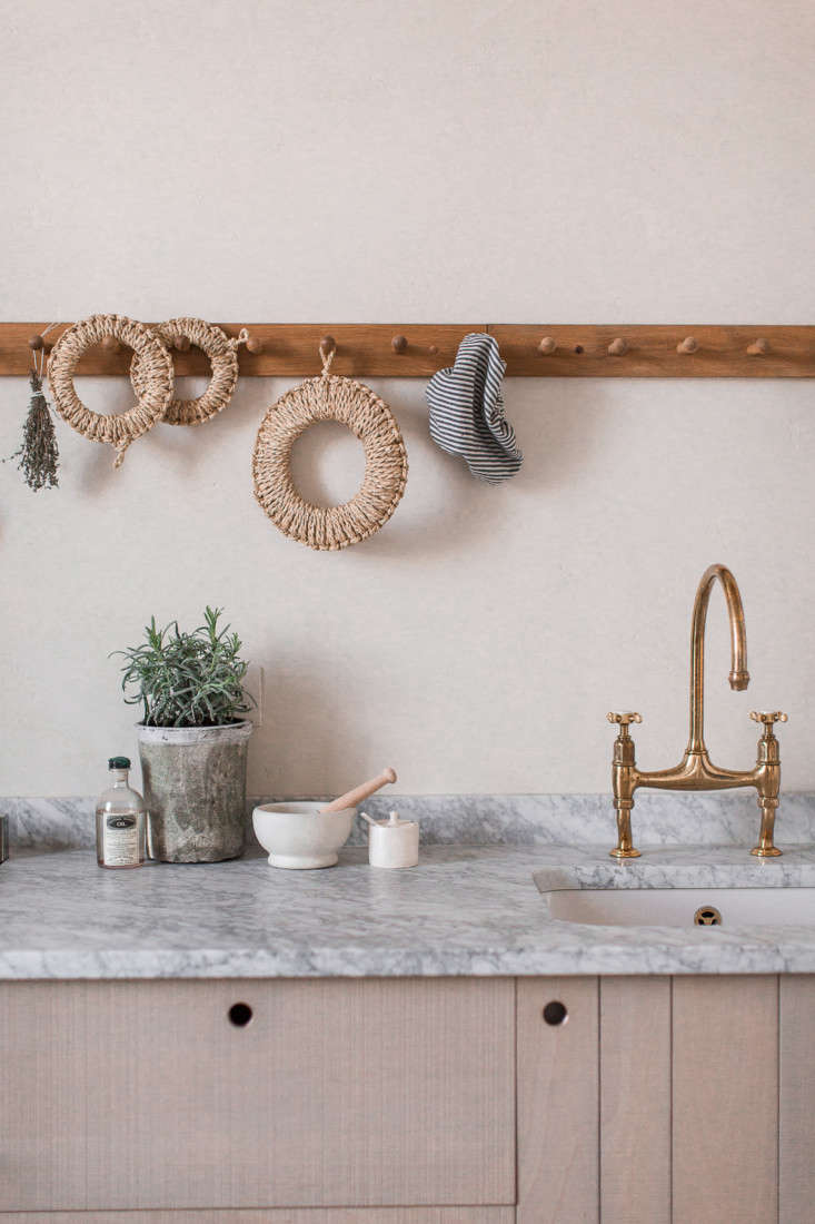 Above: The bridge faucet is deVol’s Aged Brass Ionian Tap. The peg rail, sourced from a small British maker on Etsy, is handy for hanging all sorts of things, including Handwoven Trivets and Cloth Bowl Covers.