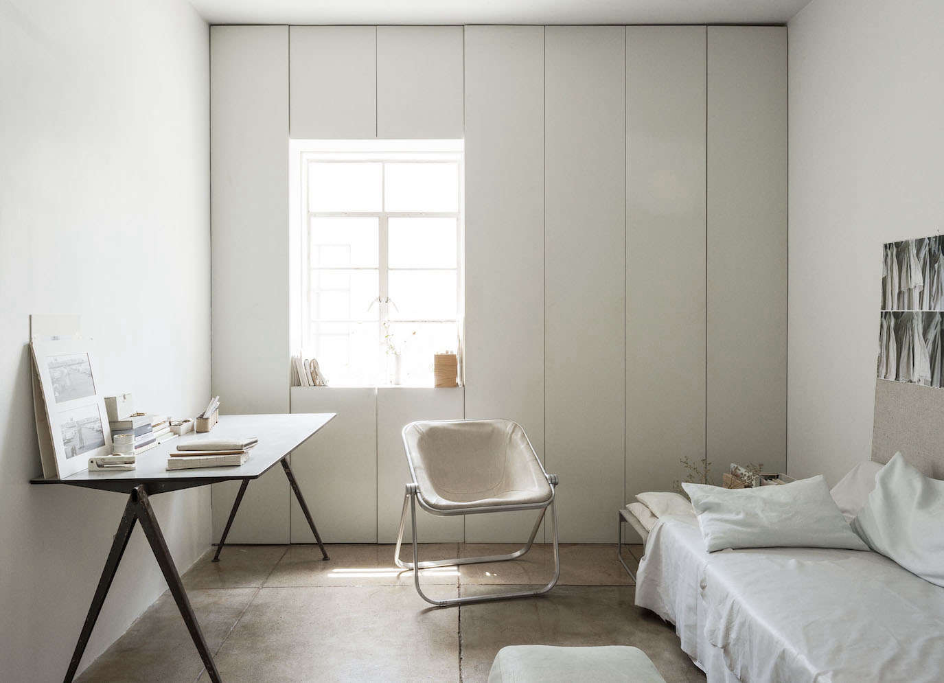 Above: The guest room has a wall of custom cabinets built around the window. “The window seemed very lonely in the corner and needed something around it. The cabinets also created a nice ledge.” The doors have pencil edges and magnetic closures; they offer enough storage that nothing needs to be left in the open except by choice. The chair is the Piona by Giancarlo Piretti for Anonima Castelli, a vintage design that Michaela modified: “I pulled off the back bar, lowered the seat, and then re-covered it in white leather.”