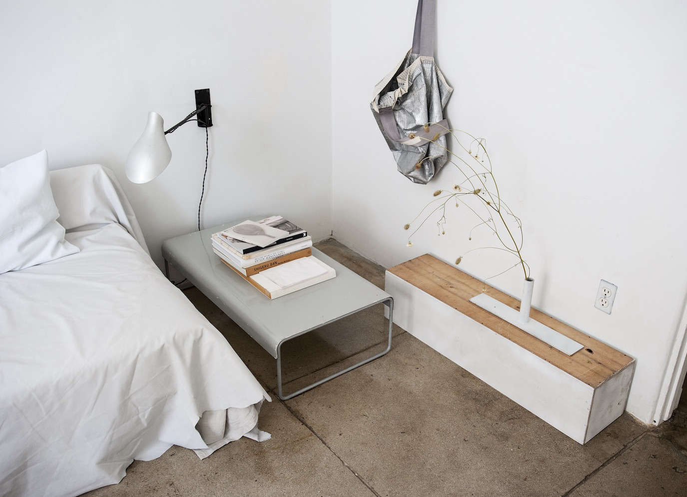 Above: A silvery bedside vignette. The low metal table is a Cassina design that Michaela has had for years; the One Arm Sconce is by New York designer David Weeks. A metallic tote hangs on the wall.