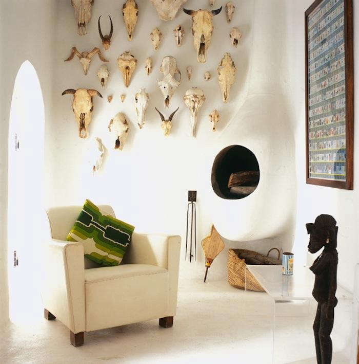 Above: Timeless and contemporary: watched over by myriad skulls, this eclectic room feels rather like a modern day Lascaux.