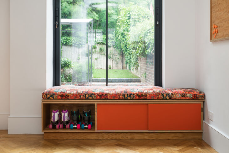 Above: “The window seat fills what could easily otherwise have become dead space,” says Alan. “This is a great space for watching the seasons change in the garden, reading a book, or just as a nook for the kids’ roller boots.” Koza made the bespoke velvet cushion.