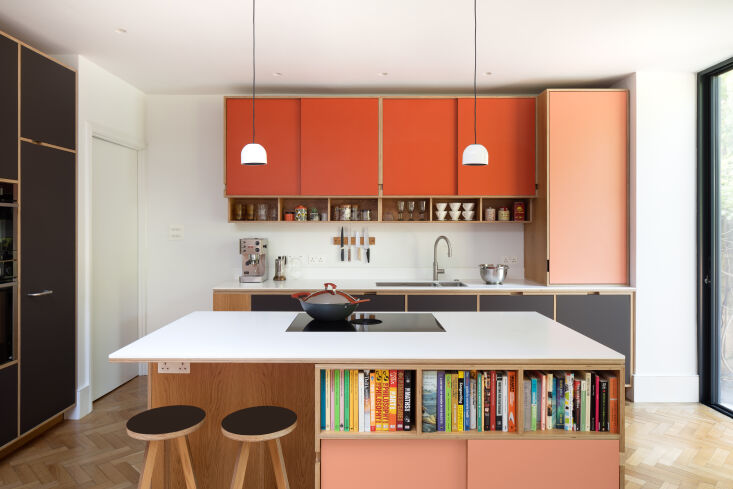 Another hard-to-ignore Uncommon Projects kitchen, this time in cheerful shades of coral and hot orange. This kitchen belongs to Rachel Kay, her husband, George, and their two daughters, Seren, nine, and Eira, six. It’s on the ground floor of a three-story Victorian terraced house in Stoke Newington, North London. They moved in just before the first UK-wide lockdown in spring 2020. “The previous family had been here for 25 years,” Rachel explains. “Every room was painted white, so we were keen to add some color and make it feel like home. For me, the kitchen is the hub of a family home so we wanted to create a space that was both functional and colorful.”