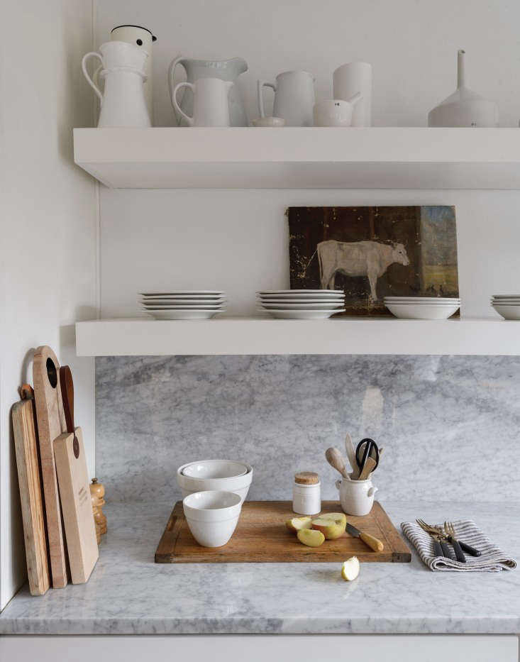 Above: Floating open shelves display our collection of white stoneware dishes; most of the pieces are from Sweden and England. The backsplash and countertops are Carrara marble.,