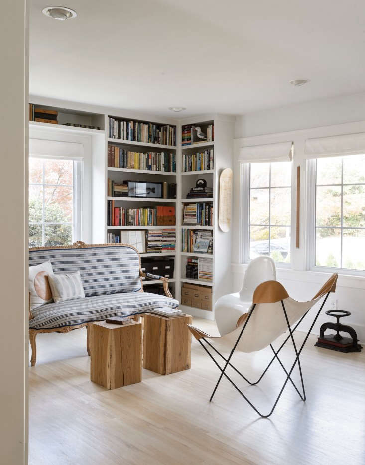 Above: We turned the front room into a library and added built-in shelves along the walls. My husband had one wish during the remodel: floor-to-ceiling shelves to hold his collection of antique fly-fishing books. (To learn about the linen upholstered settee, see my post Before & After: Izabella’s Reinvented Settee, Vintage Scandinavian Fabric Included.) The wooden stumps are white oak and cut at a local mill. The white Panton chair by Vitra is vintage, and the butterfly chair has a Leather Chair Cover from Urban Outfitters.