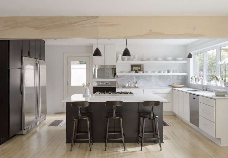 Above: The kitchen opens to the living room and features black and white drawers and cabinets, and Spinneybeck leather pulls. The black pendant lamps are Bestlite by Gubi and the stools are by French Nicolle, still in production since the 1930s. We installed a 36-inch drop-in gas cooktop by Bertazzoni in the island. The refrigerator and freezer are by Electrolux, and the dishwasher is by Asko. (As for the faucet, see my post High/Low: Dornbracht vs. Grohe Kitchen Faucet to learn more.)