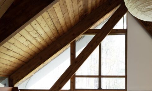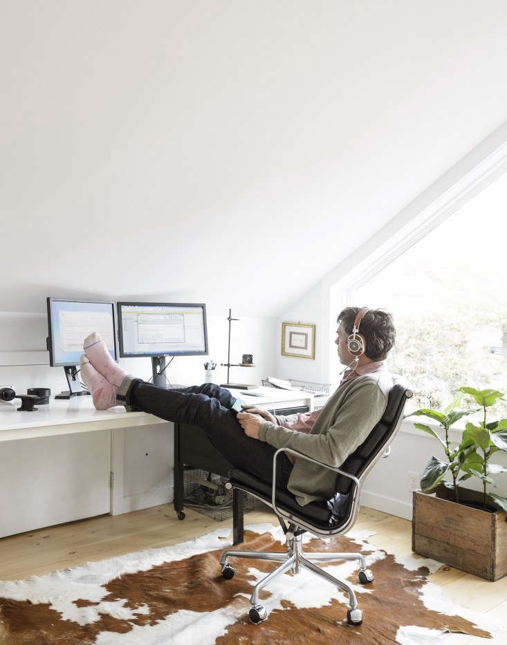 Above: We converted the attic space into a living area and an office, adding 450 square feet to the home. Insulation, walls, flooring, and large windows were installed. Stuva Storage Benches from Ikea hold the children’s Playmobil toys. The chaise lounge comes from Greycork (a furniture startup that no longer exists) and the floor lamp is Ranarp from Ikea. I bought the cowhide at a local leather shop.,