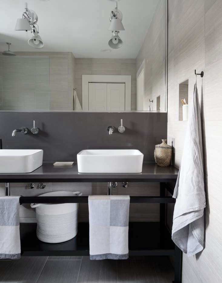 Above: Our master bathroom has a custom-built steel vanity, double vessel sinks, and wall-mounted faucets. The counter and backsplash are quartz Silestone. The bathroom walls are tiled from floor-to-ceiling, and the large mirror, (extending all the way to the ceiling) makes the bathroom feel larger. We installed Tolomeo Wall Spot Lights upside down (see my post Design Sleuth: The Tolomeo Light Takes a Turn). I have an obsession with linen fabric, and I source most of our linens (new and vintage) from Sweden. The towels are from Vävaren, a linen weaver in Båstad, Sweden. The iron Chiba hook came from Rikumo.