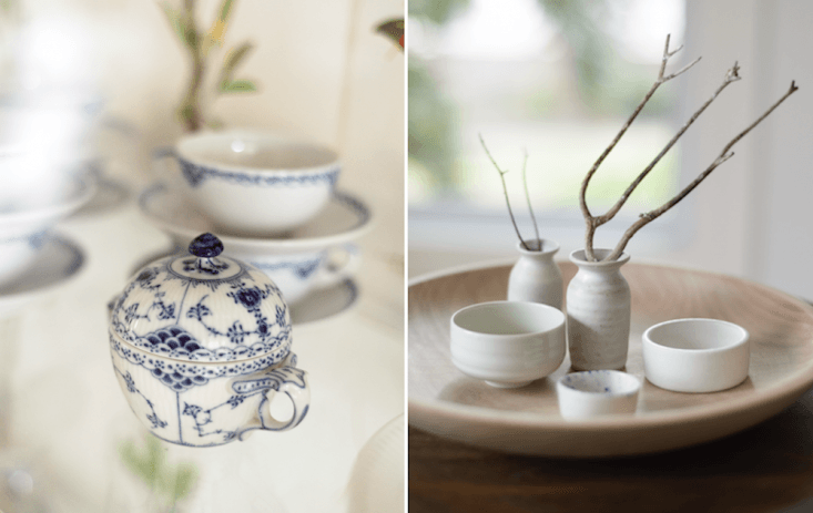 Above left: A blue fluted sugar bowl by Royal Copenhagen. Above right: A wooden bowl by artist Silvia Song (I found it at a Remodelista San Francisco market) holds small ceramic bowls and vases.