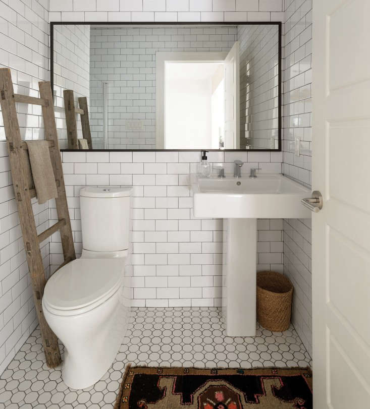 Above: This bathroom was initially configured as a powder room, but we soon realized that our far-flung family and friends needed a shower, so plans changed (three times) and we eventually turned the space into a full bath. Floor-to-ceiling white subway tile covers the walls; we chose a dark gray grout to hide dirt. We bought the small vintage Turkish Kars carpet from Christian Rathbone during a Brooklyn flea market visit, and we use a vintage wooden ladder to hang towels. The toilet is Kohler’s Persuade and the pedestal sink is by American Standard (it’s no longer available).