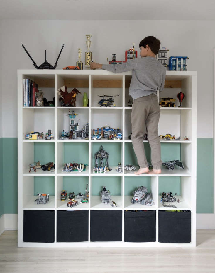 Above: Ikea’s Expedit shelf unit (it’s been renamed Kallax) comes in handy for displaying our son’s Legos and other toys. The walls are half-painted in Farrow & Ball’s Arsenic and Benjamin Moore’s Decorator’s White.