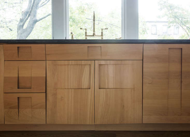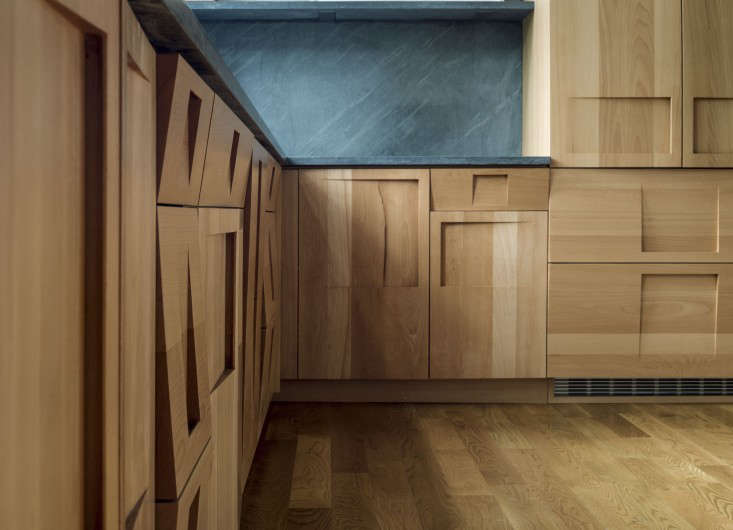 Above: After careful deliberation, the designers settled on beechwood for the cabinetry. Their client wasn’t fond of dark wood, and the lighter species of beech complemented the existing oak floor. (Workstead retained the oak flooring that had been installed during the contractor-led renovation.) It also had the right amount of graining and character to avoid overwhelming the geometric cabinet design, and is a wood that will hold up over time. The carved handles are half an inch deep; allowing enough gripping room to make doors and drawers easy to open.