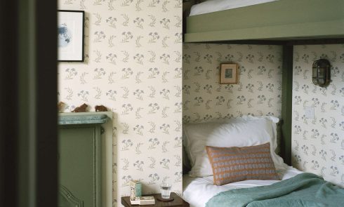 The stainless steel kitchen sink is an undermount from Julien, and the faucet is an Easton Classic Gooseneck from Waterworks in unlacquered brass. The kitchen walls are painted in Farrow & Ball’s Elephant’s Breath, with molding in Purbeck Stone.