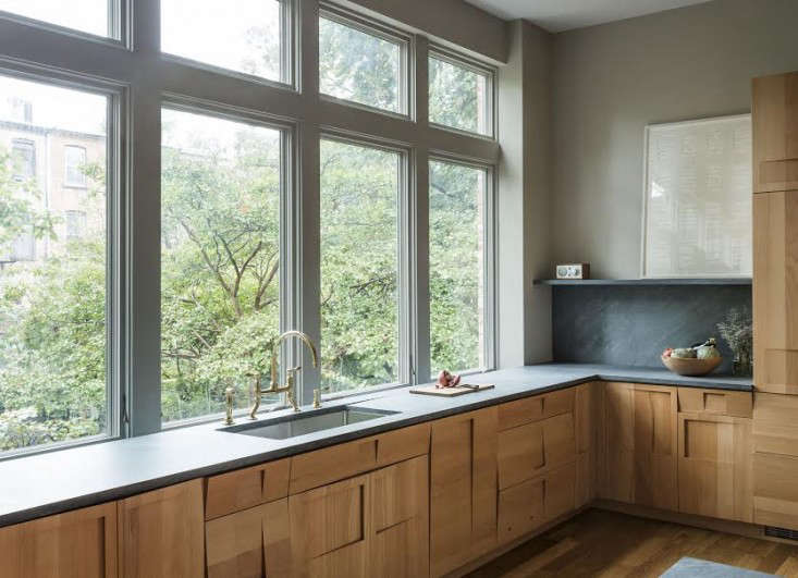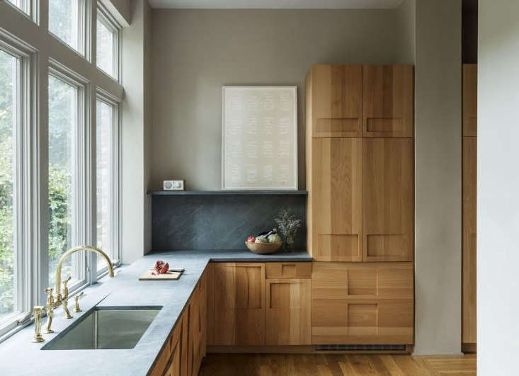 Above: The architects chose Pietra Cardosa–a type of schist–for the countertops because it complements the tone of the beech and features a “subtle, directional movement in the stone.” On the back wall, note the shelf made of Pietra Cardosa, mounted via integrated brackets underneath.