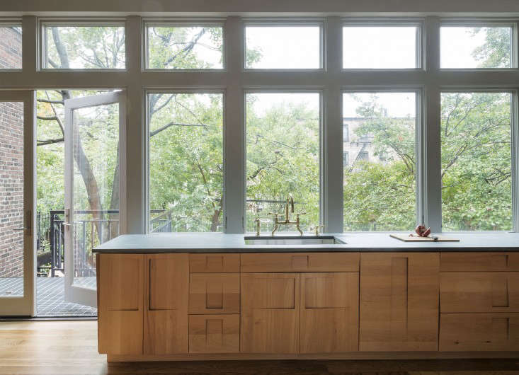 Above: The architects capitalized on the bountiful light streaming into the uncommonly wide brownstone and sought a cabinet design that would add visual interest to the room. “The carved handles look extremely subtle or very dramatic depending on the time of day,” Mahoney says.