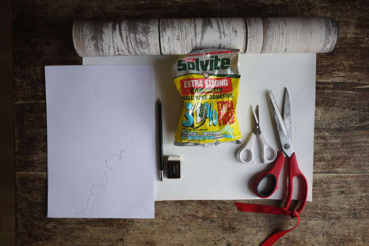 Above: Lay out the pieces; the dimensions of your headboard will depend on the dimensions of your bed. Next, you can create a full size mockup of the pattern to trace onto the back of the wallpaper, or you can draw the pattern onto the wallpaper freehand, and cut it out. Note that you’ll need to make sure that from piece to piece the seams in the wallpaper pattern match up.