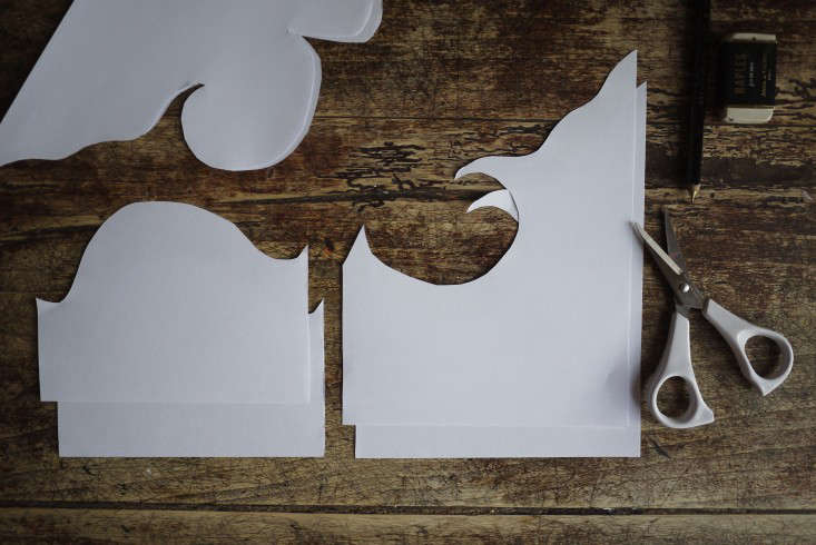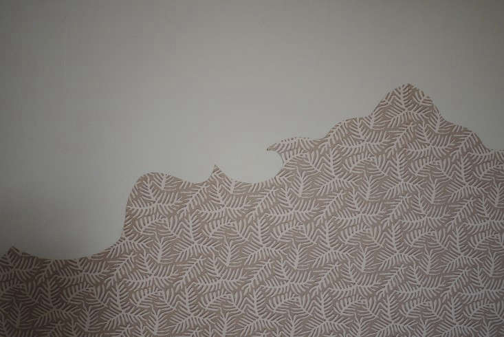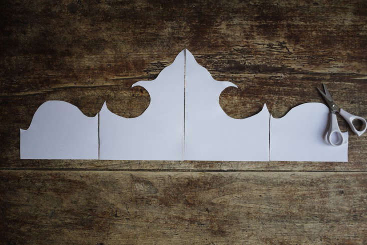 Above: Cassi has a steady-enough hand that after sketching the desired shape, she drew her headboard directly onto the wallpaper and cut it out in sections. For novices like us, she recommends first cutting out a small mockup of the design, shown here. In order to make sure your pattern is completely symmetrical, draw one half of the final shape on a piece of paper, layer it on top of another sheet of paper, and cut out the shape. (The concept is similar to drawing half a heart on a folded piece of paper.) Continue to do this for the outer edge pieces until you have a complete maquette.