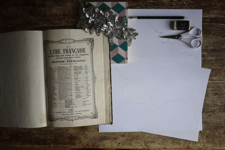 Above: Cassi found the scrolling silhouette of her headboard in the decorative border of an old French book. “You need to find a nice curving pattern–or use mine. Practice drawing it on blank paper, so you’re to be able to do it on the wallpaper,” she says.