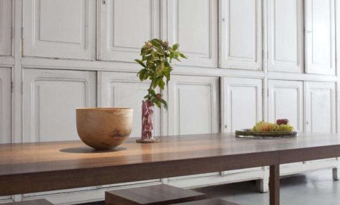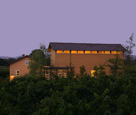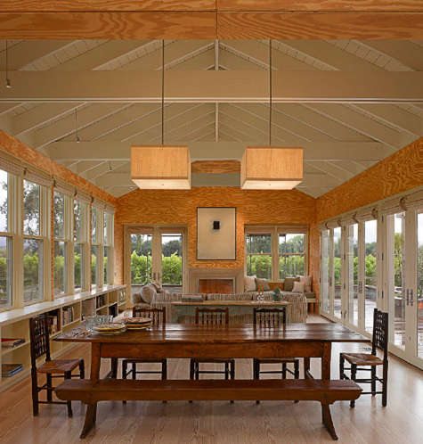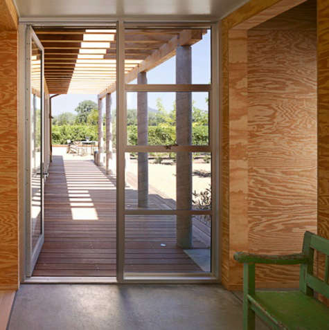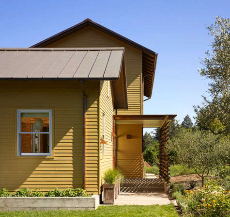 San Francisco architect Nick Noyes looked to local barns and farmhouses for inspiration in the design of this weekend retreat in Healdsburg, California. Located on a 40-acre vineyard in West Dry Creek, the house is composed of two copper-roofed gable wings, connected at the entry by an aluminum storefront system; shade is provided by sunscreen woven from reclaimed grape stakes from the site. A single-story wing functions as the main living space, with windows and doors lining either side; bedrooms are housed in a two-story wing overlooking the vineyards. The interiors are clad in southern yellow pine plywood for what Noyes calls a “Bay Region modernist effect.” Photographs by Cesar Rubio.