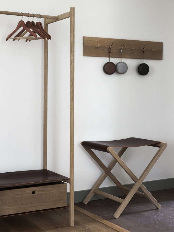 Above: Halleröd designed a custom oak peg rail, standing clothes rack, and folding luggage rack for guest room entryways.