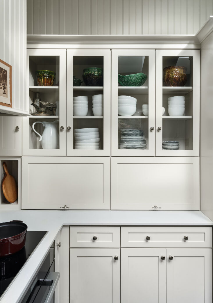 Above: Every inch of the compact kitchen was designed with storage in mind. This hardworking corner includes a glass-fronted hutch, two appliance garages, and a nook for small cutting boards.