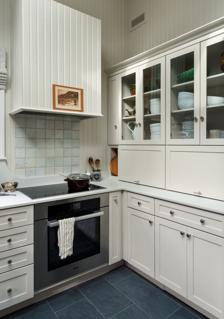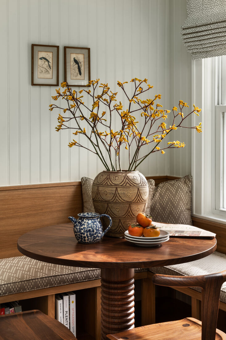 Hollie and her design director, Victoria Bailey-Adamson, absorbed all these personal details and poured them into a thoughtful redesign of their clients’ small suburban kitchen. They installed beadboard walls and traditional cabinetry for a cottage kitchen look; they commissioned a banquette that channels the simplicity of Japanese millwork; they improved the room’s functionality and augmented its storage; and they focused on unfussy, enduring materials in natural tones.