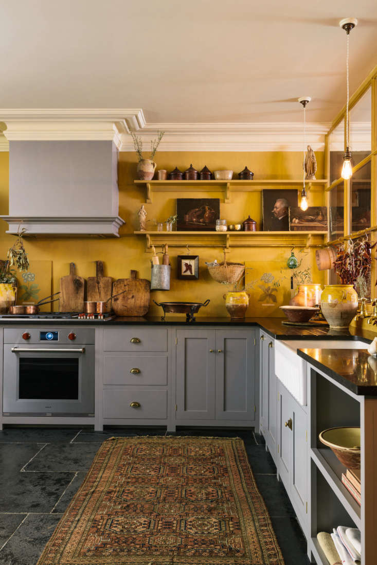 Above: “Cool stone floors, warm umber tones, and collections of items that evoke a cook’s kitchen,” says Parker, on the critical elements that make up this space. The cabinets are painted “Lead” (from deVOL’s own collection of Shaker colors); the walls Farrow & Ball India Yellow; the trim Farrow & Ball Off-White.