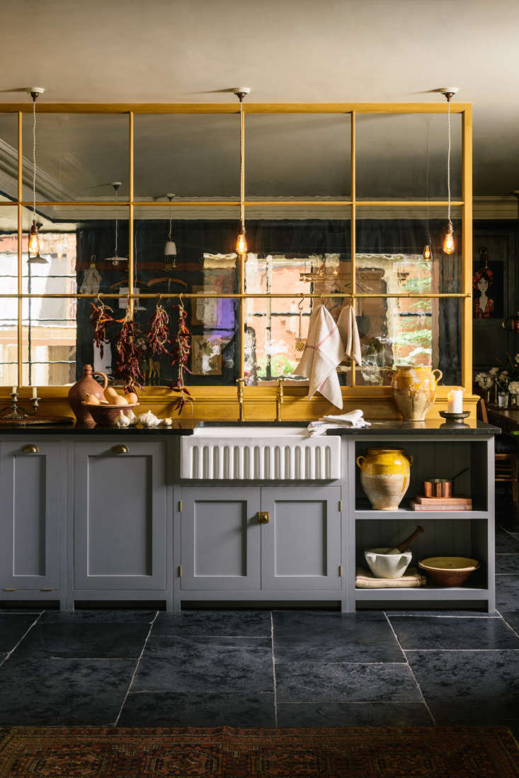 Above: The Single Fluted Sink is from deVOL, as is all the hardware, including the Aged Brass Mayan Taps by Perrin & Rowe and the Hanging Rail. A partition featuring heritage glass separates the Real Shaker Kitchen from another kitchen just beyond it.