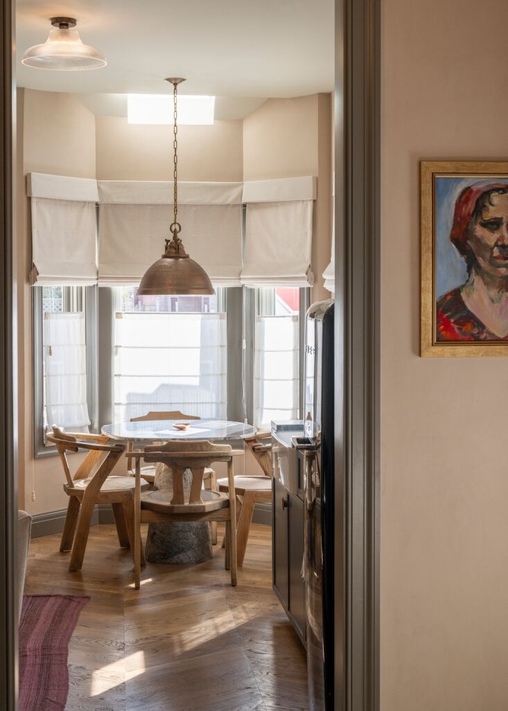 Above: A cast iron clawfoot tub and freestanding brass faucet in the king suite along with a vintage stool, oil painting, and linen Roman shades. Photograph by Julie Pointer Adams.