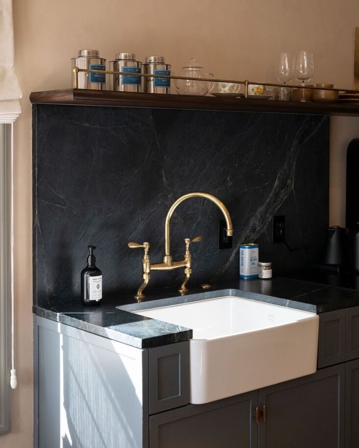 Above: A kitchenette complete with apron front sink, brass bridge faucet, and the basics atop a walnut and brass shelf.